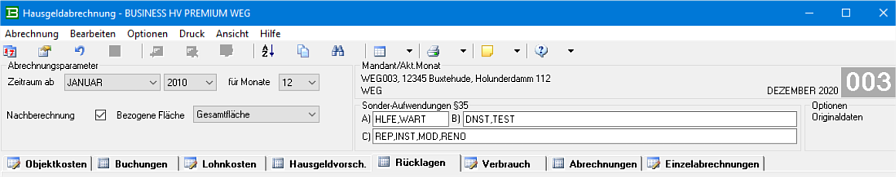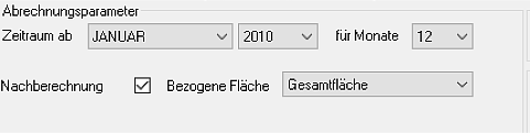 Als Standardwert wird das abgelaufene Kalenderjahr vorgeschlagen. Normalerweise werden 12 Monate für den Abrechnungszeitraum eingestellt, es können jedoch für Sonderfälle auch Teilzeiträume gewählt werden. In diesem Fall werden nur die anteiligen Kosten dieses Zeitraums für die Abrechnung berücksichtigt!