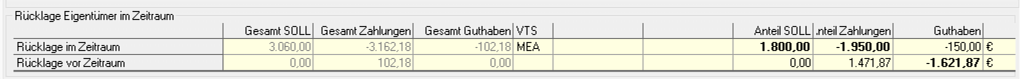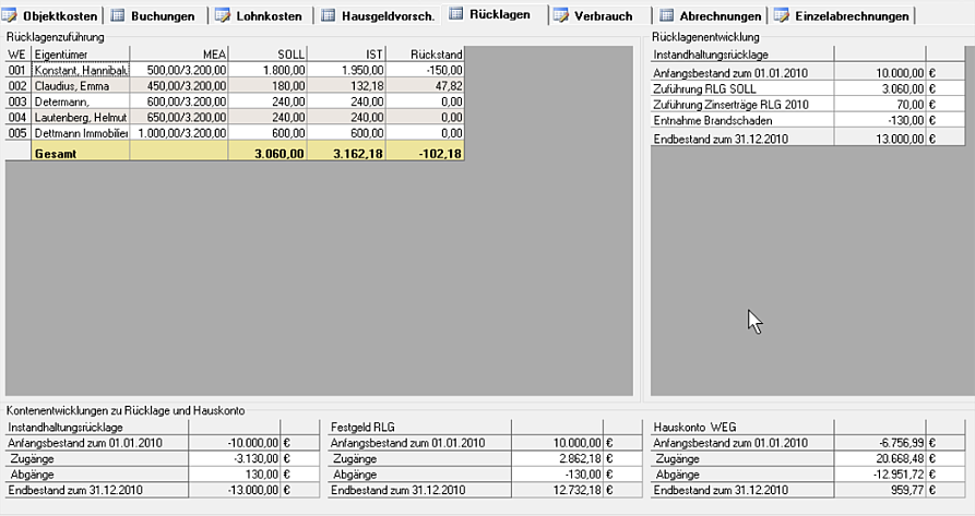 Die Abrechnung der Rücklage erfolgt im Vergleich zwischen den Soll-Stellungen (entsprechend dem Wirtschaftsplan) und den darauf gezahlten Beträgen mit dem Hausgeld. Wurden die Soll- Vorgaben nicht erfüllt, wird ein entsprechender Nachforderung-Betrag ausgewiesen.